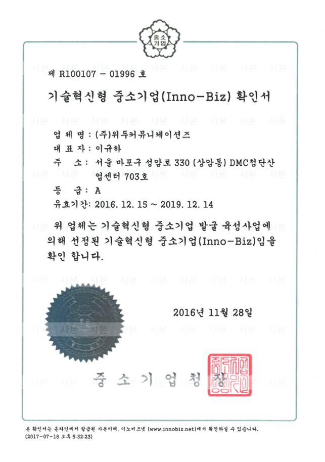 ㆍ 중소기업청 기업혁신형 중소기업(INNO-BIZ) 선정