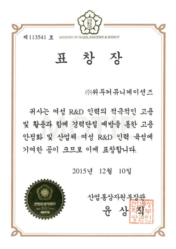 산업통상자원부 표창장 페이지 정보 작성자 WeDu 댓글 0건 조회 6,398회 작성일 19-05-30 19:34 본문 2015-12-10 표창장 제 113541호 여성 R&D 인력 고용 산업통상자원부장관 윤상직 List Previous서울클러스터 어워드 우수상 19.05.30 Next감사장 제 143호 19.05.30