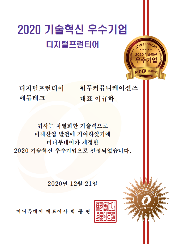 2020 기술혁신 우수기업 페이지 정보 작성자 WeDu 댓글 0건 조회 6,364회 작성일 21-12-31 12:58 본문 2020-12-21 2020 기술혁신 우수기업 디지털프런티어 에듀테크 머니투데이 대표이사 List Previous2020 소년한국 우수 어린이 도서 선정 21.12.31 Next2020 서울산업진흥원 2020 DMC어워드 21.12.31