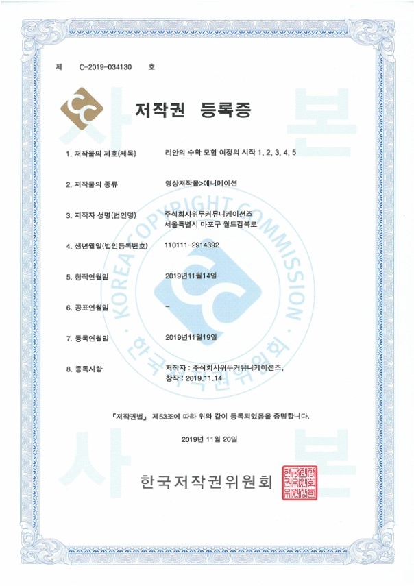 [한국/저작권] 리안의 수학 모험 여정의 시작 1,2,3,4,5 페이지 정보 작성자 WeDu 댓글 0건 조회 6,119회 작성일 21-12-31 12:36 본문 2019-11-20 저작권 C-2019-034130 영상저작물>애니메이션 List Previous[한국/저작권] OLL KIDS/MATH 21.12.31 Next[한국/저작권] 리안의 수학 모험 애니메이션 OST 19.11.25